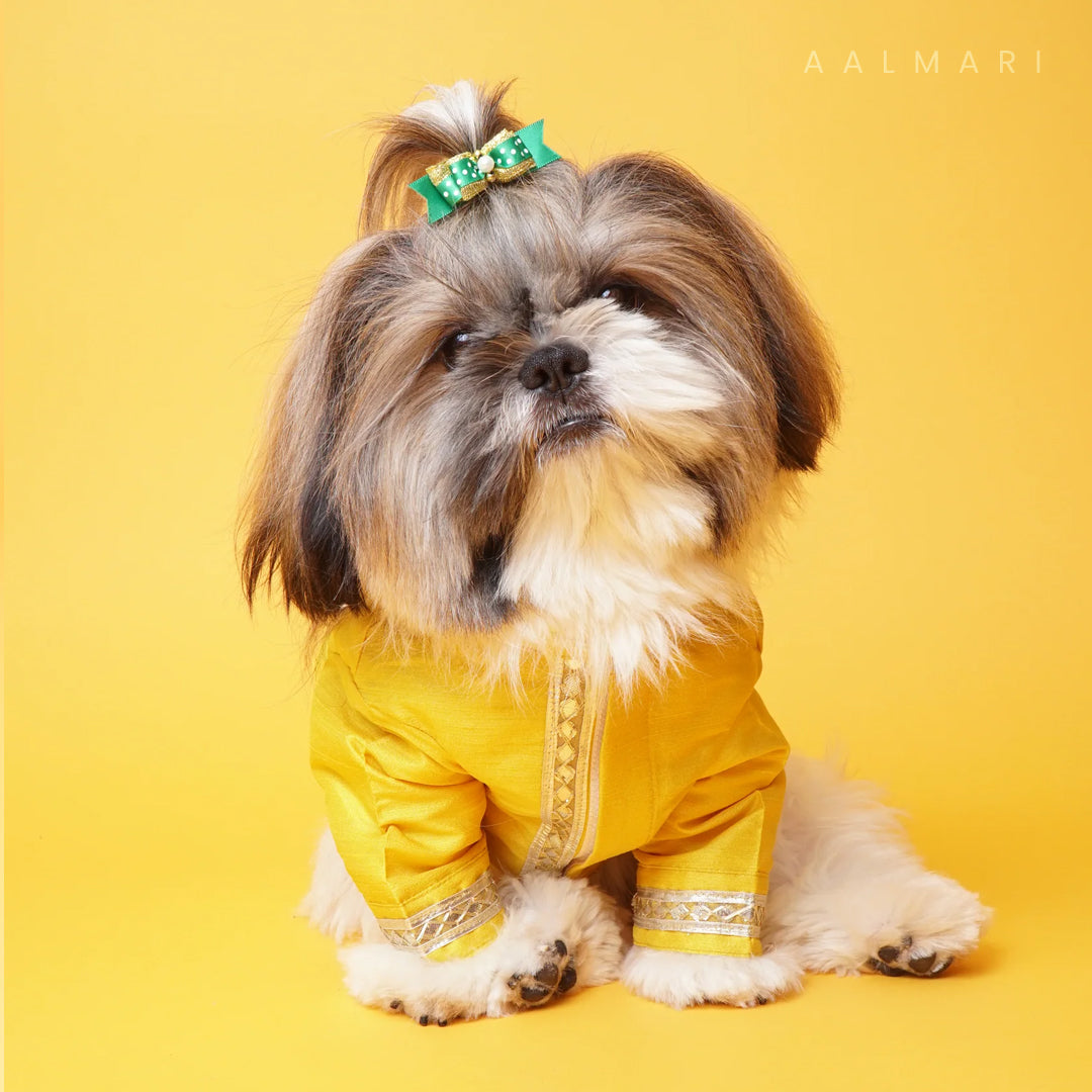 "Add a festive flair to your pet’s wardrobe with our Silk Yellow Gota Patti Kurta. Crafted from luxurious silk with intricate Gota Patti detailing, this kurta is designed to make your furry friend shine on special occasions. Stylish, comfortable, and eye-catching, it’s the perfect outfit to let your pet join in the celebrations. Dress them up and watch them dazzle—order now!"